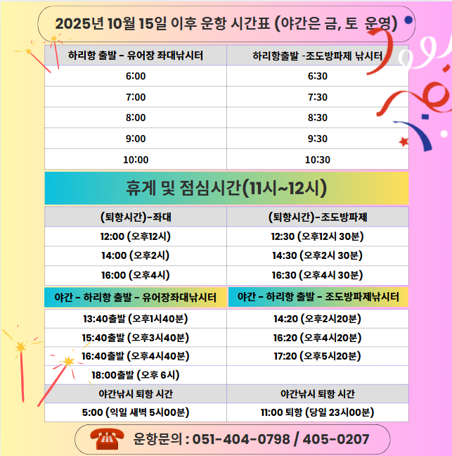 2025년 10월 15일 이후 동삼어촌체험마을 낚시터 운항 시간표입니다. 페이지 정보 작성일 25-10-23 09:02 본문 #동삼어촌계#동삼어촌체험마을#좌대낚시터#가족체험#낚시체험#태종대#도시어부#낚시포인트#감성돔#조도방파제#낚시#문어#쥐치